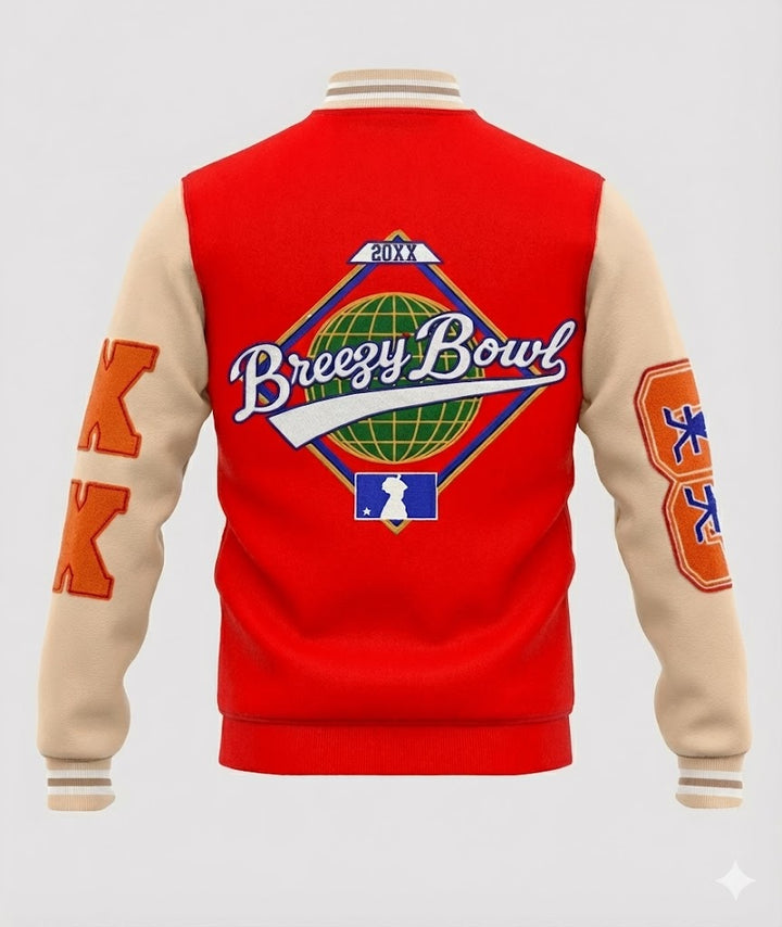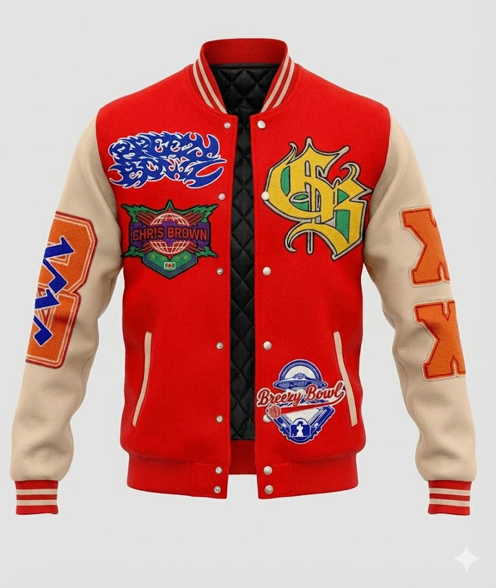 The jacket features a striking red wool body paired with contrasting beige faux-leather sleeves, giving it the same eye-catching aesthetic often seen in Chris Brown’s fashion appearances. The mix of wool and faux leather offers both comfort and durability, creating a premium varsity look fit for concerts, casual outings, or everyday streetwear.