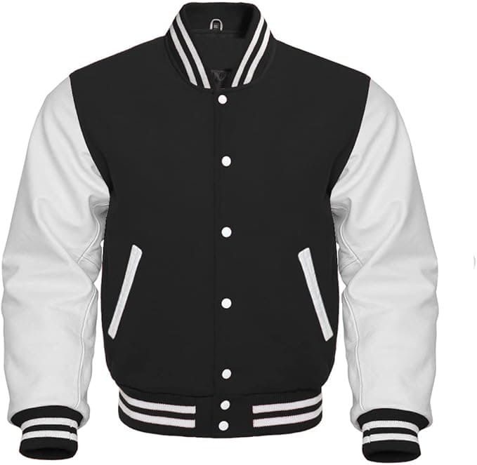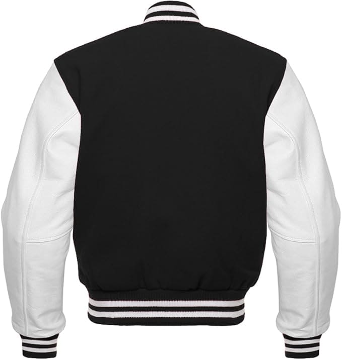 This Dakota Black & White Varsity Jacket brings that timeless college-style look — clean, simple, and always sharp. The body is made from warm, durable wool, paired with smooth white faux-leather sleeves for that iconic two-tone varsity contrast.