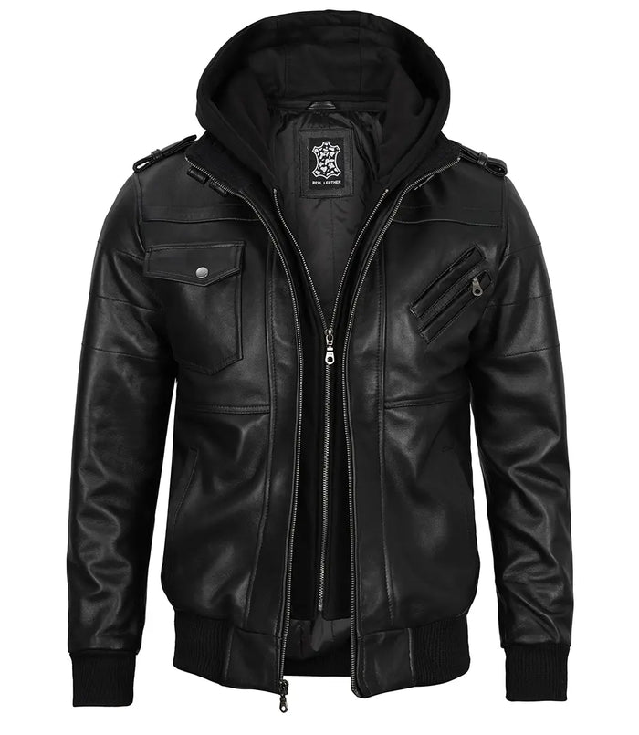 Edinburgh Men’s Black Bomber Leather Jacket with Removable Hood, designed for those who demand comfort, functionality, and premium craftsmanship. Made from 100% genuine lambskin leather, this jacket offers a luxurious soft touch with the durability needed for everyday wear.