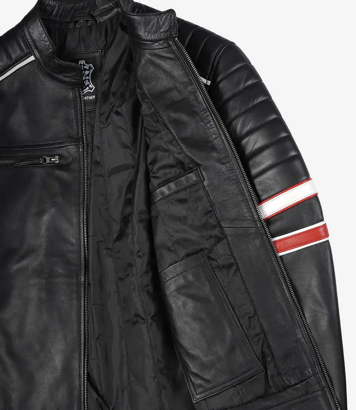 Expertly made from 100% real lambskin leather, it features a black waxed finish accented by red and white dual racing stripes, giving it a distinctive and sporty edge. The smooth polyester lining ensures lasting comfort, making it an all-season essential.