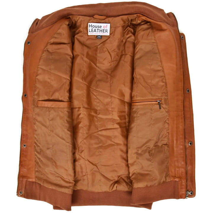 This tan brown bomber jacket features a YKK zipper with button fly, buckle collar, and four outer pockets, giving it a rugged yet refined appearance. The soft polyester lining ensures lightweight comfort — ideal for both casual wear and smart layering.