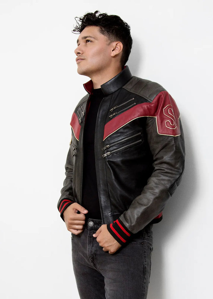 Crafted from high-quality Cosplay Leather, the jacket features a bold red chest pattern, sleek dual chest zippers, two rib-level zips, and the iconic “S” shoulder emblem — symbolizing the legacy of the Spider-Verse hero. With a smooth YKK zip-up front and fine inner viscose lining, it blends durability with flawless craftsmanship.