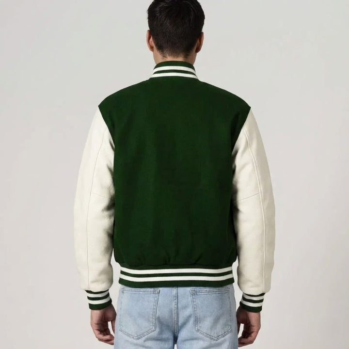 Show off classic American style with the Steven Kelly Green and White Varsity Letterman Jacket for Men. Made from 100% premium wool with a soft quilted lining, this jacket brings comfort and heritage together in one timeless design.