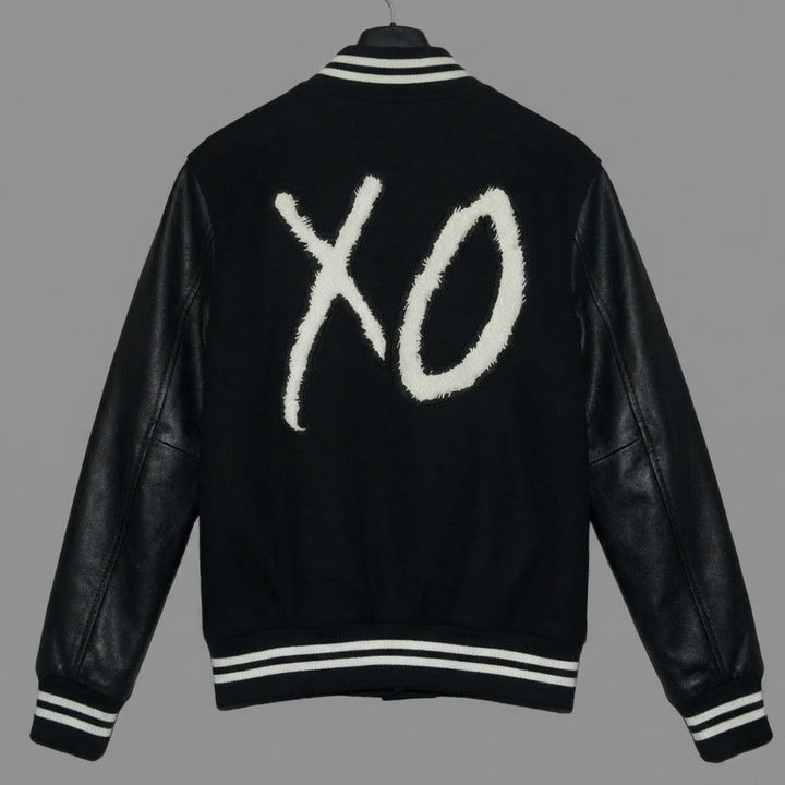 Bring home the unmistakable style of The Weeknd’s XO era with this premium black varsity bomber jacket. Designed with a wool body for warmth and structure, and faux-leather sleeves for a luxurious contrast, it captures the exact streetwear edge that defines Abel Tesfaye’s most iconic outfits.